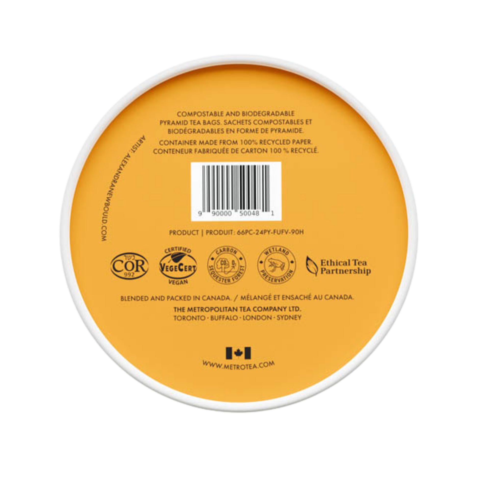 Our Turmeric Ginger Peach Wellness Tea is small-batch blended and carefully packed in Canada . It comes in a paper-based canister with 24 plant-based luxury pyramid tea bags , both of which are naturally compostable . Our commitment to sustainability ensures that every cup is both indulgent and eco-friendly , from field to cup .